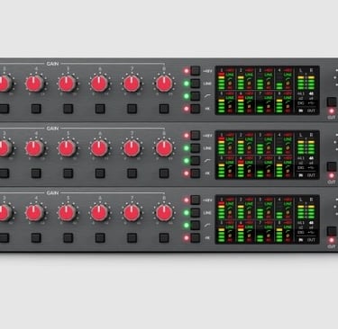Os pré-amplificadores são o coração desta unidade. Eles entregam um ganho limpo e linear, mas com o toque de mestre da Solid State Logic: o botão Legacy 4K. Inspirado na lendária série de consoles SSL 4000, este circuito analógico introduz um realce de altas frequências e uma distorção harmônica sutil que "empurra" o som para a frente da mixagem. Não é uma emulação digital; é um caminho de sinal analógico real que confere aquele brilho clássico que definiu décadas de hits.